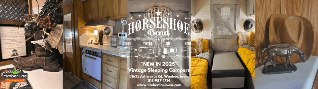 Escape to Horseshoe Bend and stay in one of our 4 vintage campers inspired by the hit show Yellowstone. Choose from Jimmy, Teeter, Rip, or Beth — each one full of character and charm — or reserve all 4 for a family reunion or getaway. Call 515-987-1714 to book your Yellowstone adventure!